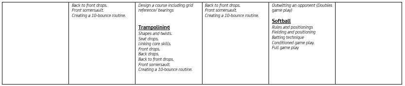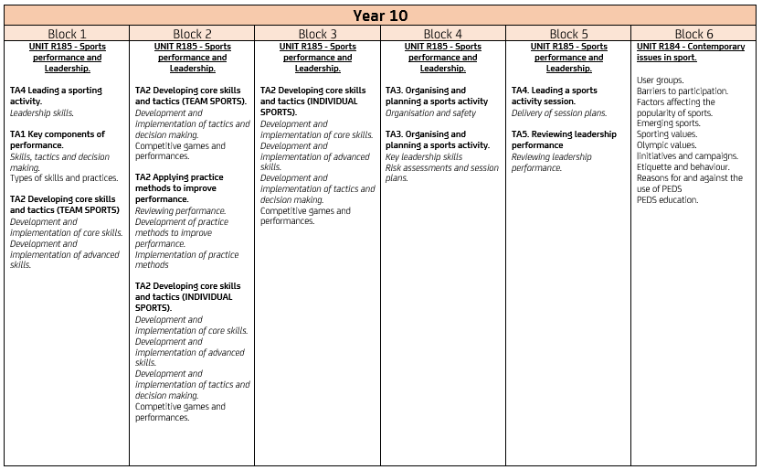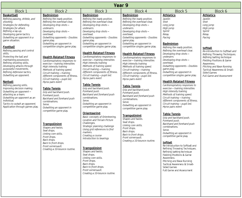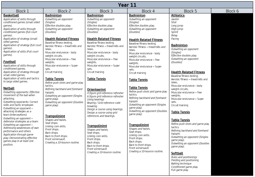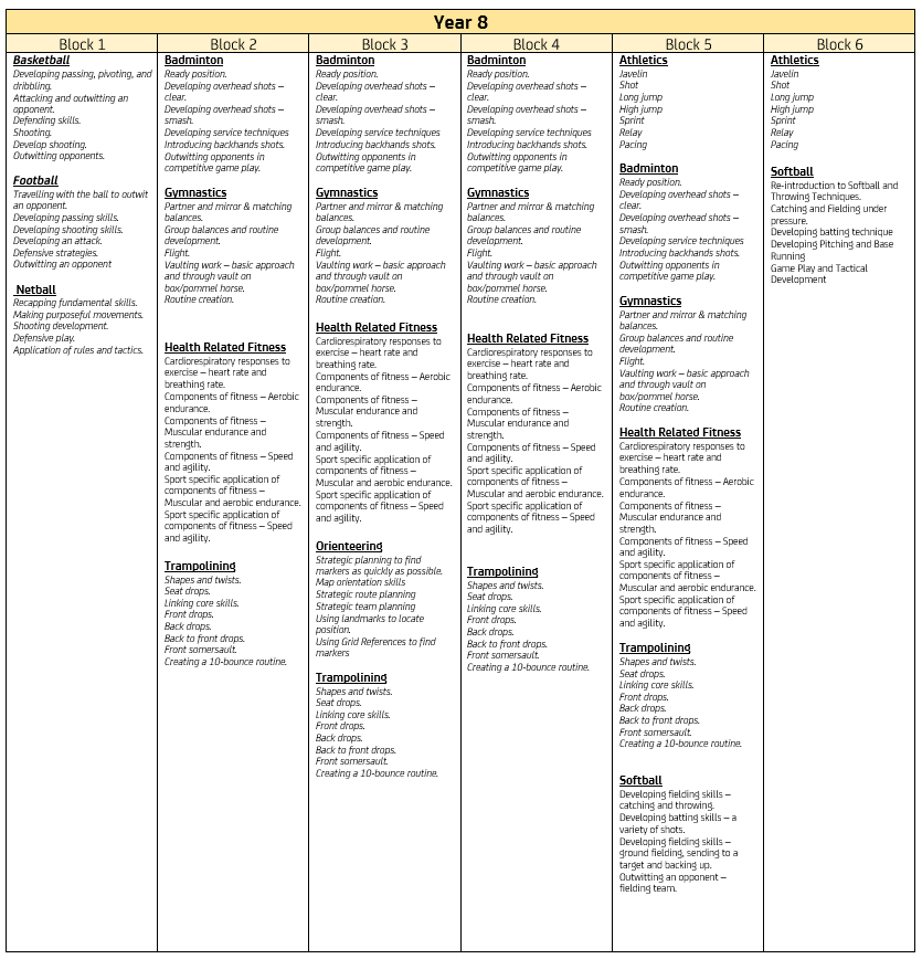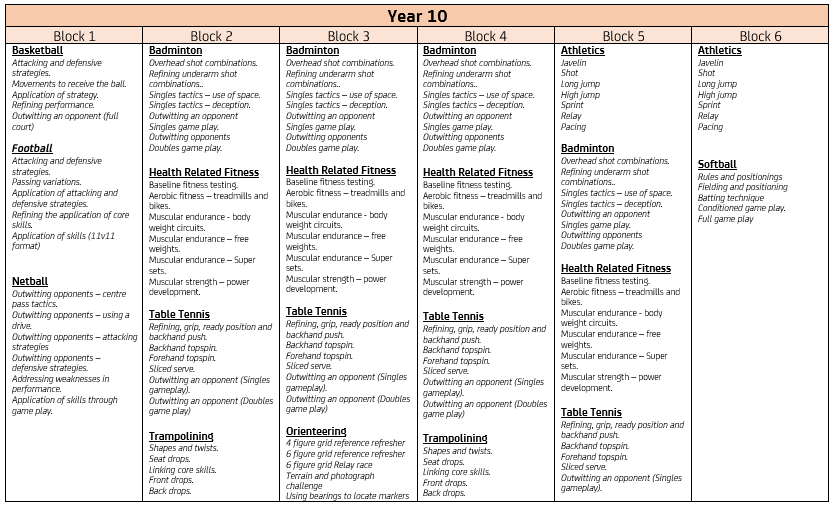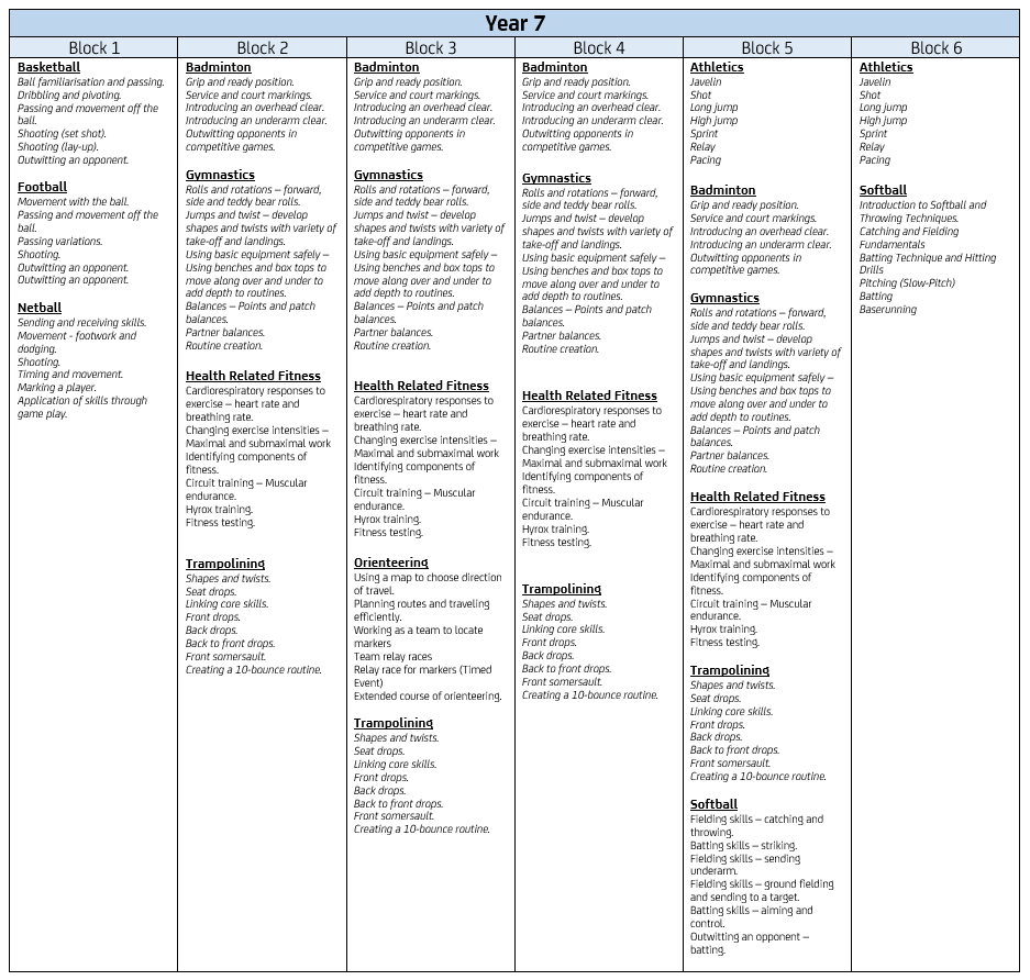 NB – Activities are repeated throughout numerous blocks as different teaching groups participate in different sporting activities at any given time. This is due to access to facilities and equipment. By the end of the academic year, students will all complete the same activities.